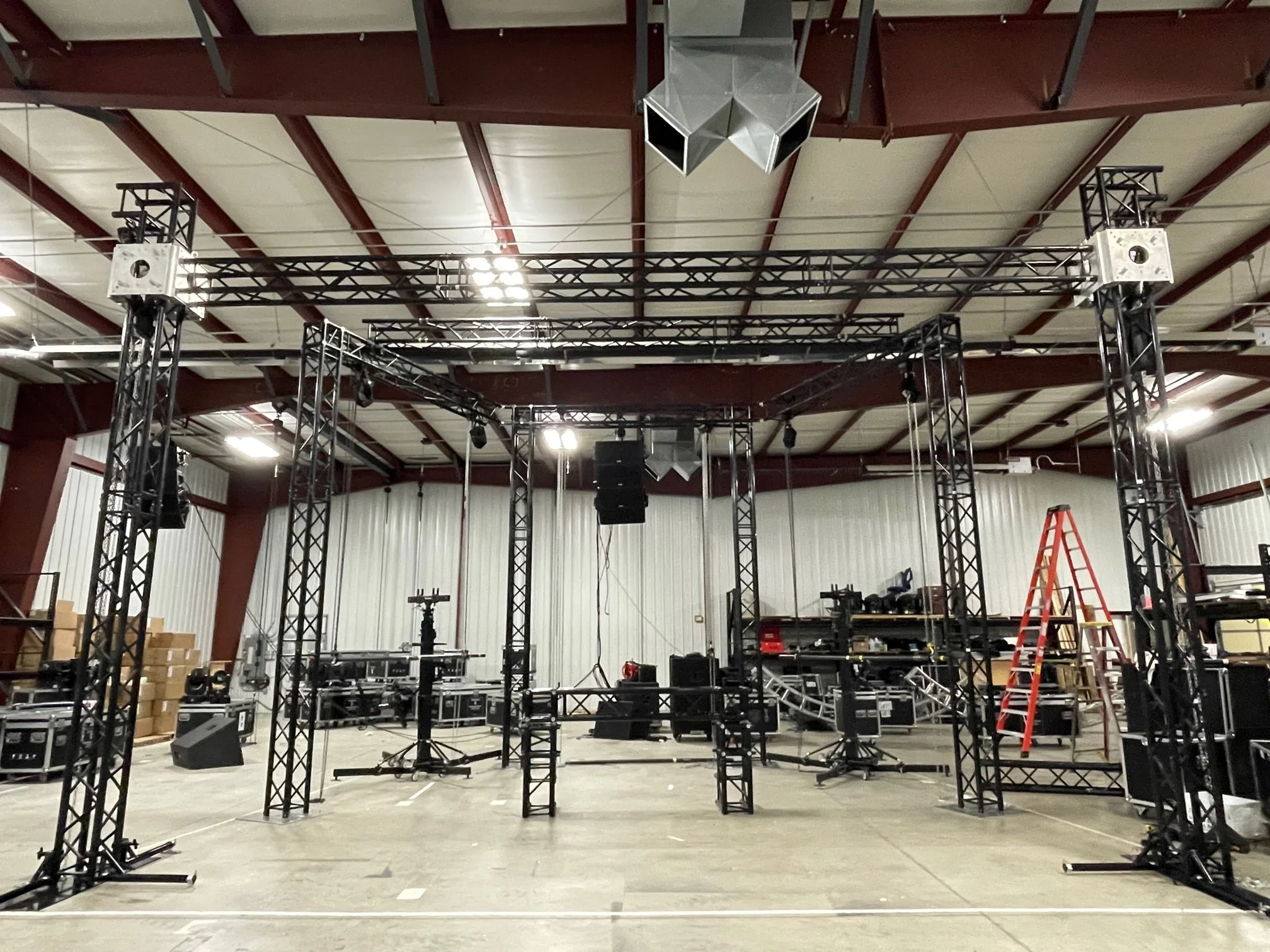 CSM offers a 24-deck (24ft w x 16ft d x 32” h) Intellistage system, with stairs and skirts. This system is applicable for any flat-ground, indoor or covered-stage use, and can be arranged in any 4ft x 4ft deck array you wish. We also have over 50 meters (169 ft) of F34 black 12” box truss in a variety of lengths, including L-corners, junction blocks, pivot points, trolly sleeves, base plates and a 7m (23ft) circle truss. We have over 20 manual chain hoists, genie lifts, span sets, beam clamps, module truss ladders, and other supplemental rigging for most small-medium venue applications.